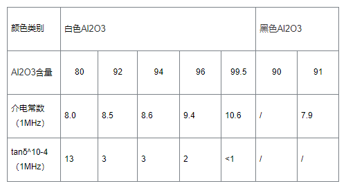 氧化鋁陶瓷通過氧化鋁純度進(jìn)行分類,氧化鋁純度為>99%被稱為剛玉瓷,氧化鋁純度為99%、95%和90%左右被稱為99瓷、95瓷和90瓷,含量> 85%的氧化鋁陶瓷一般稱為高鋁瓷。黑色氧化鋁陶瓷基板多用于半導(dǎo)體集成電路及電子產(chǎn)品中,這主要是由于大部分電子產(chǎn)品具有高光敏性,需要封裝材料具有較強(qiáng)的遮光性,才能夠保障數(shù)碼顯示的清晰度,因此,多采用黑色氧化鋁陶瓷基板進(jìn)行封裝。氧化鋁相關(guān)性能數(shù)據(jù)如圖: